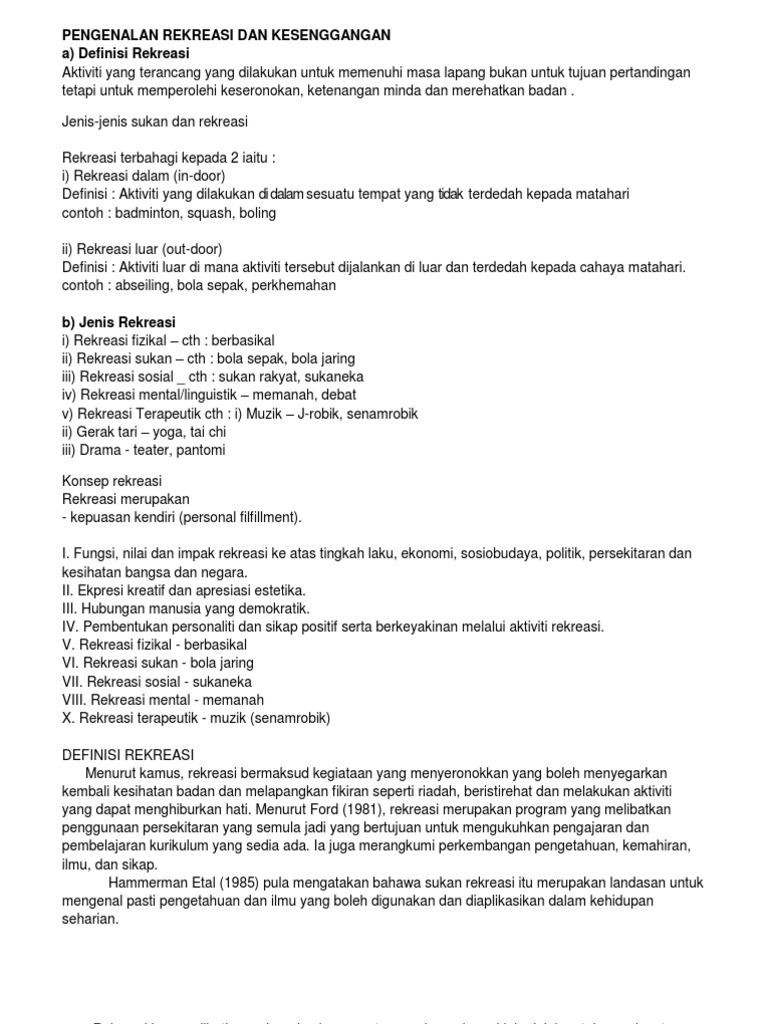 Definisi Contoh dan Cara Membuatnya Lengkap. Rakyat Malaysia dari pelbagai lapisan masyarakat menyertai pelbagai sukan untuk rekreasi dan persaingan. Taman pribadi yaitu taman milik pribadi yang tidak dapat oleh umum.